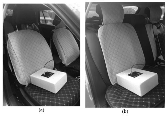We measured both broadband and frequency domain results. The measurement system was composed of two ELF MF meters (SEM-600, Safetytech, Beijing, China) that were connected to two ELF MF probes (LF-01, Safetytech, Beijing, China) by optic cables. The frequency range of the probe was 1–100 kHz and its dynamic range was 0.01 nT to 10 mT. All of the instruments were within their valid calibration periods during the measurements. The measurement system fulfilled the requirements of the EN 50492-2009 [15] and ICNIRP guidelines [2,16]. During measurement, the probe was held stationary while the vehicle moved. We used an acceleration sensor (LIS3LV02DL, STMicroelectronics, Geneva, Switzerland) to monitor the acceleration rate. The ELF MF probes were fixed at the center of the front and rear passenger cushions using plastic foam. According to a previous report, B intensity increases as the distance from the EV to the ground decreases [13]. The measurement configuration is shown in Figure 1.