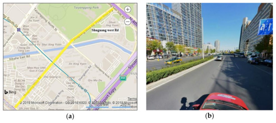Driving test environment. (a) is a map of its location in Beijing and (b) is a picture of the road.