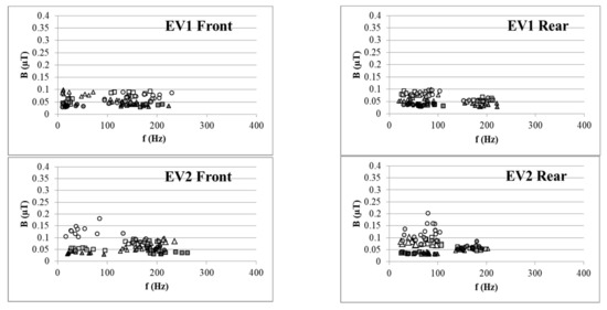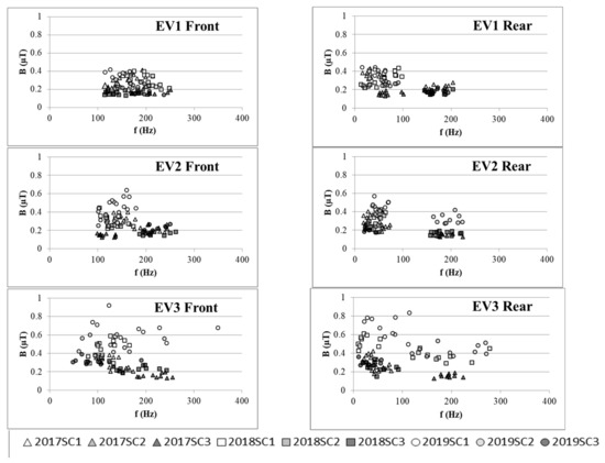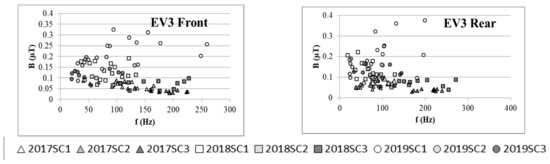 The spectral results were analyzed. The first three major spectral components (SCs, the three frequency components which have the highest amplitude were sorted by amplitude) for the measured results are plotted in Figure 3 (acceleration) and Figure 4 (constant-speed driving). The SC frequency volatility apparent in the figures may be due to measurement uncertainty and substantial modification of the spectrum during operation of the electrified systems. For EV3, the variation between the major SCs was larger than the range for EV1. There was a similar trend between the last measurement of EV2 and its previous results. For EV1, the variation between SCs during the two years was rather small. The maximum variation of B for EV3, which underwent major repairs and component replacement, was up to 0.54 μT in the acceleration mode (difference between 2019SC1 and 2017SC1 for front seat position), whereas the maximum variation for EV1, which only underwent regular maintenance, was approximately 0.02 μT (difference between 2019SC1 and 2017SC1 for front seat position). EV2, which had its hubs changed, had a variation between those of EV1 and EV3. The results for the constant-driving mode revealed the same effect. In general, the frequency domain results were consistent.