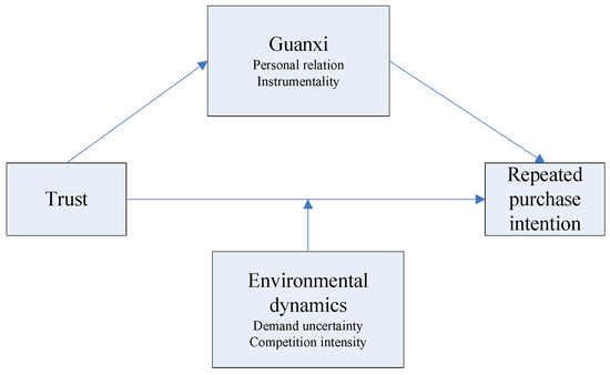 In view of the above questions, based on relationship marketing and social exchange theory, from a perspective of Chinese ‘relationships’, this paper investigates firstly, the impact of the two dimensions of guanxi (i.e., personal relations and instrumentality) on trust. An emotional relationship is a relationship based on human emotions and established by a person to satisfy the emotional needs of both parties [15]. The instrumental relationship refers to the social relationship established by individuals with others in order to achieve some goals [15]. Secondly, the effect of trust on repeated purchase intentions. Thirdly, the moderating effects of demand uncertainty and competition intensity in the dynamic environment on the relationship between trust and repeated purchase intentions.