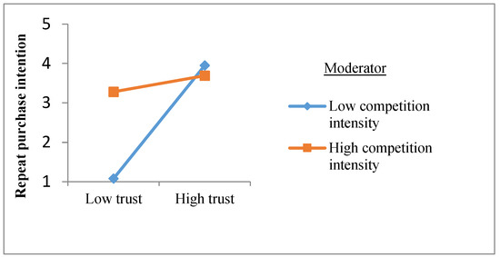 The same method is used to examine the moderation effect of competition intensity. Firstly, model 2 has verified the significant positive impact of trust on repeated purchase intentions. Secondly, the impact of trust and competition intensity on repeated purchase intentions is examined. As shown by model 3, both have significant effects (β = 0.431, p < 0.01; β = 0.088, p < 0.05). Finally, the interaction term of trust and competition intensity is added to the model 3, this leads to model 5. The fit of model 5 is also good (R2 = 0.358). The coefficient of the interaction term is significant (β = −0.601, p < 0.05). Therefore, the moderation of the intensity of competition is verified, and the Hypothesis 7 is supported.