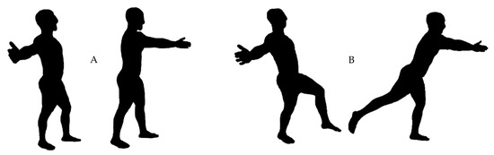 In-water data collection was held in a 25 m indoor pool (12.5 m width and maximal depth of 1.80 m), with a mean water temperature of 29 °C. Participants were randomly assigned to perform in different days the following water fitness exercises (Figure 1): (A) horizontal arms adduction (HA) and (B) rocking horse with horizontal arms adduction (RHAdd). The HA is characterized as maintaining a static trunk with lower limbs fixed to the ground [16] when performing the upper-limbs action. During the motion of the arms, full extension is required, without any restriction in the range of motion of shoulders at abduction. Both hands are positioned at a 90° angle, considering the water surface. In RHAdd, the upper limbs have the same pattern of motion as in HA. The lower limbs’ actions show a continuous and simultaneous motion, with horizontal arms adduction and abduction [17]. In every cycle between leaps, there was a knee flexion when the participants’ performed arms abduction, while the opposite leg did a hyperextension. The level of water surface was set at near xiphoid process, as recommended by Barbosa, Garrido, and Bragada [5].