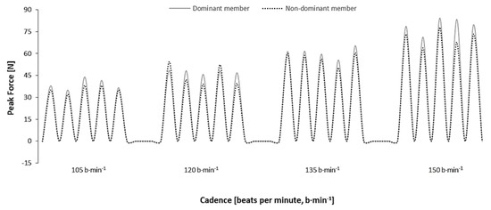 Figure 2 depicts a typical force curve between the dominant and nondominant limbs’ force in HA, during the incremental protocol. The overall trend was to an increase in the absolute propulsive peak force from slower to faster cadences.