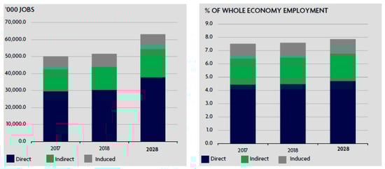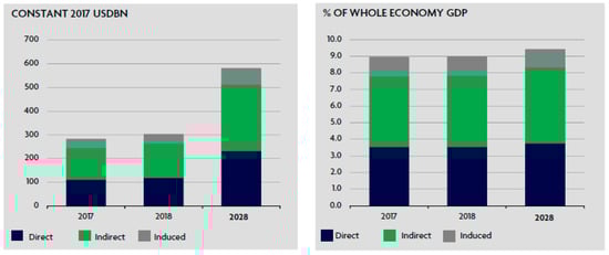 In the South Asian region, the share of the tourism sector in GDP was 8.9% ($281.6 billion) in 2017 with the speculation of further growth of 7.2% in 2018. It will be 9.0% of GDP ($301.8 billion) with auxiliary income of 6.2% by the year 2028 to reach 9.4% of GDP ($579.6 billion), as presented in Figure 1. In 2017, tourism contributed 7.5% of jobs to the employment sector (49,931,500 jobs) and a speculated increase of 3.0% or a total share of 7.6% of the job market in 2018 (51,436,500 jobs). By the year 2028, the share of tourism in the job market is expected to touch 7.8% of the job market (63,006,000 jobs), as presented in Figure 2 [5].