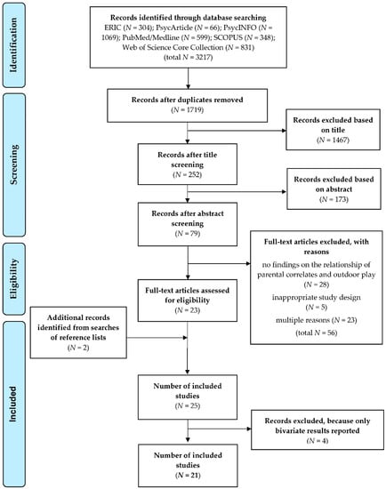 A systematic literature search was conducted to give an overview of the current state of research on parental correlates of outdoor play in children and to summarize primary studies. The systematic review follows the Preferred Reporting Items for Systematic Review and Meta-Analysis (PRISMA) [37].