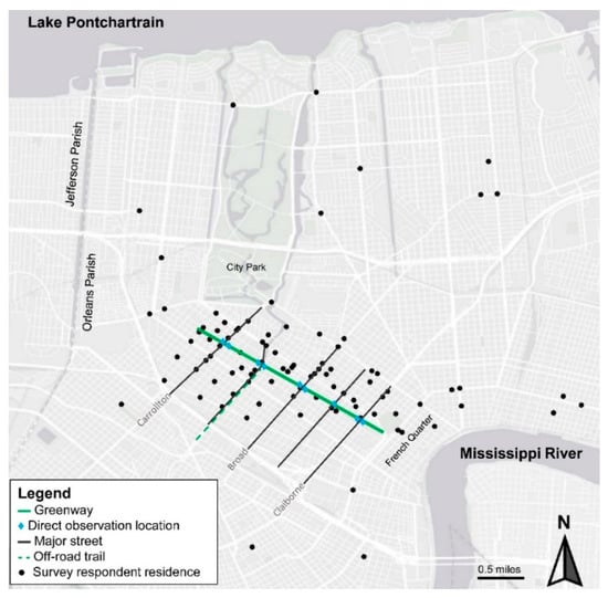 Map of the greenway and residences of intercept survey respondents in Orleans Parish, Louisiana.
