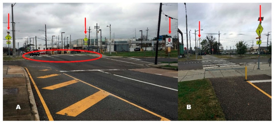 The greenway in this study is a 2.6-mile bicycle and pedestrian trail connecting diverse neighborhoods with multiple commercial and historic destinations, including the French Quarter in New Orleans, LA (Figure 1). The greenway also connects to another off-road bike and pedestrian trail. It was conceived of as a multi-use transportation corridor and linear park [24]. The city invested 9.1 million dollars in the project, breaking ground in 2014 and opening the greenway in 2015. The trail is lit with LED trail lighting and includes curb extensions, signalized high visibility crosswalks and Americans with Disabilities Act-compliant curb ramps at sidewalk corners. Major street crossings are outfitted with rectangular rapid flash beacons (RRFB), which are user-actuated amber light emitting diodes (LEDs) that can be actively or passively triggered [25]. One of the crossings included in this study is shown (Figure 2) from the perspectives of the motor vehicle (Figure 2A) and greenway user (Figure 2B). Signs and beacons are marked with red arrows and the location of crossing on the road is circled in red in Figure 2A. The RRFBs in the present study require manual activation with a push button. The greenway averages 830 daily total users and the majority are thought to be cyclists but the counts are from infrared sensors and cannot be separated by user type [26]. Louisiana is ranked third among all states for the percent of traffic fatalities that are cyclists [27]. Two streets (Claiborne, Carrollton) included in this sample are among the most dangerous pedestrian corridors in New Orleans and another street (Broad) contains one of the most dangerous intersections for pedestrians in the city [28].