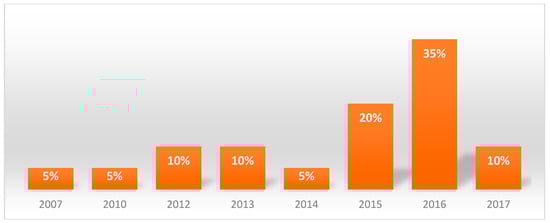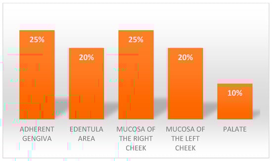 The sample consisted of 11 men (55%) with an average age of 55 years old and 9 women (45%) with an average age of 67 years old, the average age of the sample was of 61 years old. The site of onset of lesions in the oral cavity of the different patients was homogenous (Figure 1); the year of onset can be seen in Figure 2.