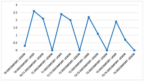 The perception of the discomfort caused by the lesion before the laser therapy results, on average, in the scale selected for the measurement of this parameter, approximate to zero. The discomfort perceived during the treatment stands at average values (between 2.5 and 2.0) and tends to decrease less evidently in the short term, while in the medium to long term it follows a decreasing trend from values of 2.6 at T0 to 1.9 at T4. The values show that on average the variable assumes significant values for all observations and that the trend decreased particularly between the second and third week of treatment. The discomfort was always described as a burning sensation (Figure 3).
