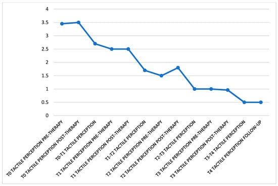 It remains substantially unchanged between before and during the treatment but the overall tendency of the values is to decrease almost constantly over time, starting at an average of 3.5 at T0 to 0.5 at T4 (Figure 4).