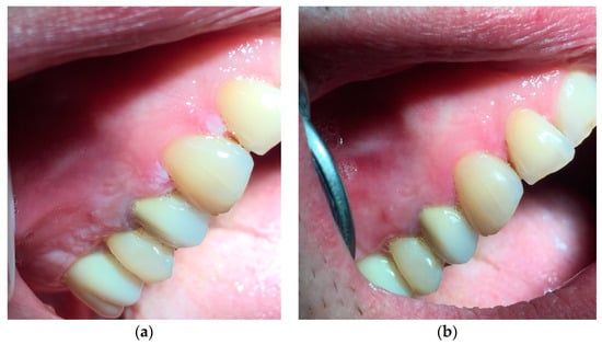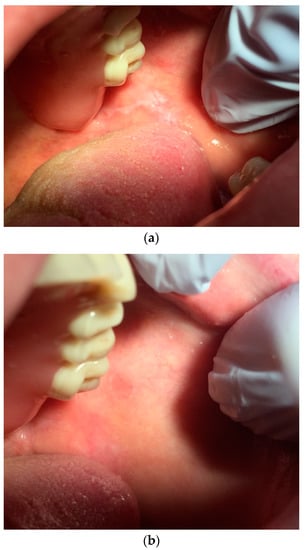 (a) Whitish and irregular area in the gingival mucosa. (b) Three weeks after the beginning of the treatment.