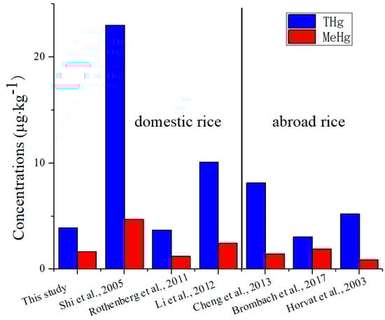 Our results for both THg and MeHg were comparable or slightly lower than results reported from markets abroad (Figure 1). Batista et al. [] reported that the THg concentrations of 44 rice samples in Brazilian market varied from 0.3 to 13.4 μg·kg−1, representing most brands in the whole country. The THg and MeHg concentrations of rice samples collected from the supermarkets of Kampong city in Cambodia were in the range of 6.16–11.7 μg·kg−1 (a mean of 8.14 μg·kg−1) and 1.17–1.96 μg·kg−1 (a mean of 1.44 μg·kg−1) [], respectively. Recently, Brombach et al. [] reported that the THg and MeHg concentrations of 87 rice samples purchased in supermarkets in the United Kingdom, Germany and Switzerland were 3.04 ± 2.7 μg·kg−1 and 1.91 ± 1.07 μg·kg−1, respectively.