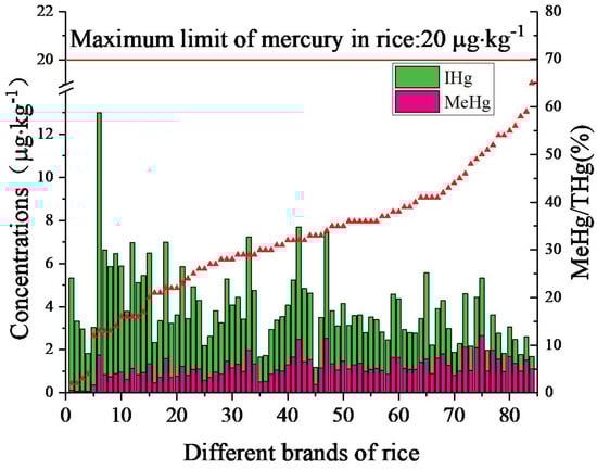 Mercury (Hg), one of the most toxic heavy metal pollutants, has been a public concern since the recognition of Minamata disease in 1956. Both inorganic and organic Hg exist in the environment. Inorganic Hg (IHg) is much less toxic than methylmercury (MeHg) to humans [], and the absorption rate of IHg in food by the human, which is about 8% [,,,], also much less than that of MeHg (95%) [,]. MeHg is the most toxic organic form of organic Hg; MeHg can cross the blood-brain barrier and through placenta in humans after entering the body, causing permanent damage to the central nervous system [,]. The Minamata Convention, formulated by the United Nations Environment Programme, came into effect on August 16, 2017, which aimed at controlling and reducing mercury emissions globally. Fish consumption is considered to be the primary route of human MeHg exposure [,]; however, recent studies have reported that rice consumption is the main MeHg exposure pathway for local residents in Hg mining regions due to elevated MeHg concentrations [,,,].