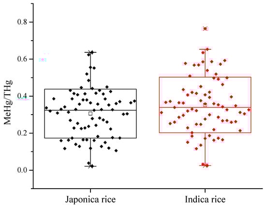 The proportion of the MeHg to THg in Japonica and Indica rice.
