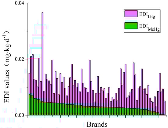 The EDIIHg values of different brands ranged widely, from 0.0017 to 0.0317 μg·kg−1·d−1 (Figure 4). The top ten brands by EDIIHg value were HBRD, BWG, XL, TXX, HJDC, TF, TGXM, QLC, LY and QL, the peak value of 0.0317 g·kg−1·d−1 recorded in HBRD. By contrast, BF, TXA, MNX, WPW, SDX, DJX, XGYJ, AMN, YZZ and PBZY exhibited the lowest EDIIHg values, and the lowest value of 0.0017 g·kg−1·d−1 was found in in BF, which was approximately 18 times lower than the highest value in HBRD.