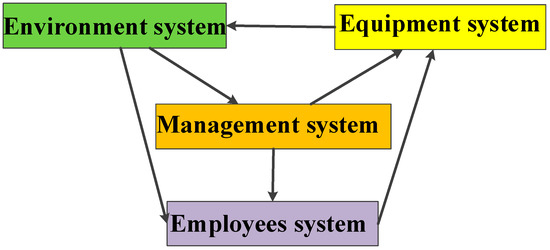 To improve the operation of the construction safety system, scholars have conducted research from two perspectives. On the one hand, some researchers have focused on human issues, such as the behaviors of employees [40], safety management practices [41], and the relationship between the two [42]. Other researchers have addressed objects and environments, such as safety equipment [43] and safety environment [44]. As for construction projects, the safety system is in a continuous and dynamic process of change in which the elements intrinsically interact. To systematically analyze the dynamic effects of lean construction tools, in this paper, we divide the construction safety system into four sub-systems: the management system, employee system, equipment system, and environment system. Of these, the construction management (managers) system is the core sub-system [19], which has responsibility for the formulation and implementation of safety measures, safety inspections, and the correction of hazards. The employee (construction workers) sub-system includes employee safety participation (e.g., taking part in safety training) and safety compliance (e.g., compliance with safety regulations) [11]. The mechanical equipment and construction environment are peripheral sub-systems. The equipment system includes safety equipment and the equipment qualification rate, key parts, and control status of the equipment. The individual behaviors exhibited in the employee system directly affect the normal operation of the equipment system, while the management system indirectly controls the equipment system via the employee system. The environment system refers to the social and natural environment wherein the construction site is located and its influence on different project participants, including the owner’s satisfaction, disputes between managers and workers, and any public complaints about the construction environment [44]. In addition, the equipment system has a direct impact on the operation of the environment system and the environment system plays a significant role in the operation of the management and employee systems [43]. Figure 1 shows the structure and relationships of the four sub-systems.