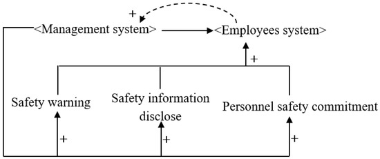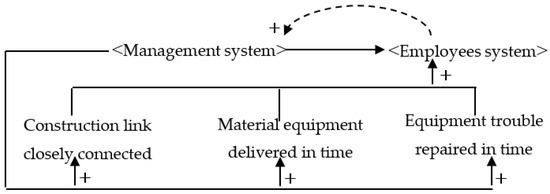 Just-in-time management (JIT) aims to reduce costs by optimizing inventory to enable the on-time supply of raw materials, semi-manufactured products, or finished products [53]. JIT management can shorten the waiting times of workers and the equipment. It has also been applied in the area of construction safety, with respect to the timely treatment of equipment failures and hidden safety hazards, the establishment of appropriate construction safety plans, and the elimination of periods of idleness. “Idle behavior” refers to the enforced idleness due to poor organization of work. Due to the defects of a construction management plan, workers have to spend more time waiting. As such, “idle” workers are likely to hang around the site and hence trigger work-related accidents. JIT management reduces safety hazards while also improving productivity. Figure 6 shows a causal diagram of a construction system in the JIT management scenario.