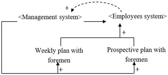The Last Planner® System, also referred to as the Last Planner®, is a new pull-in construction planning and control tool that enables foremen at the frontline of the project (the last planner) to participate in project planning and monitoring to improve planning accuracy and reduce deviations [26]. However, research on its application to safety management remains scant. Tools for applying the LPS to safety management include the participation of foremen in the formulation of the weekly plan and the adjustment of monthly plans (prospective plans). On the one hand, implementation of the Last Planner® arouses interest in safety participation by grassroots personnel, and on the other hand, it has the advantages of involving grassroots management personnel who are familiar with safety hazards at the construction site. Figure 5 shows a causal diagram of a construction system in the LPS.