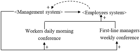Effective communication between workers and managers significantly reduces the number of work-related accidents, and conference management is reported to be the best way to communicate safety objectives [54]. Based on the lean construction concept, in this scheme, the foreman meets with construction workers each morning to discuss the work of the previous day and arrange the tasks for the day ahead. A weekly conference between the foreman and project manager is held to discuss problems that occurred during that week, which provides a good channel for solving problems at the construction site in a timely manner. It is notable that conference management is different from LPS. LPS emphasizes the participation of frontline workers in project planning and monitoring, while conference management focuses on establishing the way for communication and information sharing. Conference management not only involves the communications between project managers and foremen but also includes the daily huddles among project managers from different departments. Figure 7 shows a causal diagram of the construction system for the conference management scenario.