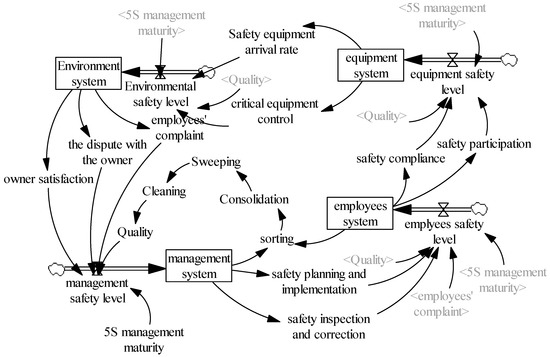 For each of the five types of lean construction tool, a construction safety system flow chart was established using the Vensim PLE system dynamics simulation software. In this study, we use the construction safety system flow chart for 5s management as an example to illustrate the analysis procedure (as shown in Figure 8). The horizontal variables include the four construction safety sub-systems—namely, the management, employee, equipment, and environment systems—and indicate the safety accumulation state of each in the system operation process. The rate variables refer to the safety level of each sub-system, which indicates the change rate of the horizontal variables. The auxiliary variables are the safety system and lean construction tools. For example, the safety plan formulation and implementation, along with the safety inspection and correction, refer to the output variables of the management system: sorting, consolidation, sweeping, cleaning, and quality, as represented in the 5S management tool. Regarding the other four types of lean construction tools, the principles of the construction safety system flowcharts are similar to that described for 5S management. In other words, the 5S management tool is replaced by the other lean construction tools to fix the structure of the safety system.