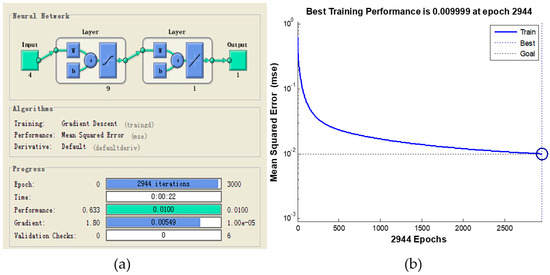 Details of the parameter estimation process are as follows. First, a multi-input and single-output BP neural network was established according to the system flowchart. The input variables are the values of the influencing factors (i.e., independent variables) in the questionnaire, and the output variables are the values of the affected factors (i.e., dependent variables). Then, we used the MIV algorithm to calculate the effect of each influencing factor on the affected factors. Second, each of the independent variables in the training sample S was incremented or decremented by 10% from its original value, to obtain two samples S1 and S2. Third, using the network to simulate the S1 and S2 samples, we obtained the simulation results Q1 and Q2. The difference between Q1 and Q2 is the change value. The MIV value was obtained by calculating the average of the change value, whereby the greater the MIV value is, the greater the influence level of the independent variable on the dependent variable is. Using the above steps, the MIV value of each variable was considered to be the correlation coefficient between the influencing and affected factors, and the system dynamics equation was then established based on the correlation coefficient. The calculation of the MIV value of the safety management level for 5S management is used here as an example. According to the construction safety system flow chart for 5S management, as shown in Figure 8, we can see that the influencing factors on the safety management level include the owner’s satisfaction, disputes with the owners, and the number of complaints about the environment and quality. Thereafter, we used the four influencing factors as input variables in the BP neural network, with the safety management level being the output variable. According to the Kolmogarav theorem [59], the use of a single implicit layer can guarantee better accuracy of the fitting results for general function mappings. The number of implicit layer nodes is determined by the number of variables in the input and output layers (m = 2n + 1, where m is the number of implicit layer nodes, and n is the number of input nodes) [60,61]. Therefore, the number of implicit layers is one, and the number of implicit layer nodes is nine. Figure 9a shows the neural network topology structure. The ‘tansig’ and ‘purelin’ functions were selected in the transfer process of the implicit and output layer nodes, respectively. The maximum number of model iterations was set to 3000, with a target accuracy of 0.01 and a learning rate of 0.05. Figure 9b shows the model simulation result. When the iteration number was 2944, a target accuracy of 0.01 was achieved, and the MIV values of the four output variables were 0.33, 0.25, 0.26, and 0.16, respectively after normalization. Therefore, the system dynamics equation was established as follows: “management safety level = 0.33 × owner’s satisfaction + 0.25 × the dispute with owners + 0.26 × employees and public complaints about the environment + 0.16 × quality”. System dynamics equations for other variables were similarly established.