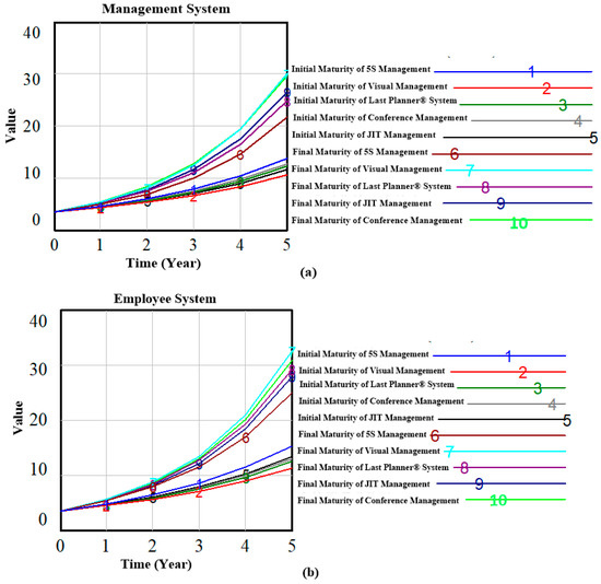 Since the duration of construction projects typically extends beyond one year, we performed a simulation analysis of the research model on a yearly basis for an overall period of five years. In addition, to analyze the influence mechanism of lean construction tools on the safety system, two maturity levels are adopted as control variables. Then, the influence level of different lean construction tools on the safety system at different maturity levels were compared and analyzed. A technical maturity level of 0.1 was recorded as “A” and that of 0.7 as “B.” The simulation analysis results are as follows.