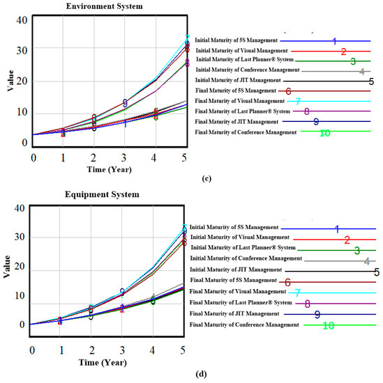 In Figure 10a, the change trend of the safety level of the management system is shown by the changing maturity level of the lean construction tools. In the figure, we can see that when the maturity levels increase from 0.1 to 0.7, the safety level of the management system is significantly improved (lines “1” to “5” indicate the initial maturities of 5S management, visual management, the LPS, conference management, and JIT management, respectively, and then become lines “6” to “10”). Of these lines, those labeled “6,” “7,” “8,” and “10” improved more than the others, which indicates that the application of JIT management, visual management, conference management, and the LPS can significantly improve the safety level of management systems. Similarly, Figure 10b shows the change trend of the safety level of the employee system when the maturity level of the five types of lean construction tool is changed. In the figure, we can see that improvement in the maturity level of the lean construction tools can greatly improve the safety level of the employee system. The most significant effects were made by JIT management, conference management, and the LPS. Of the five types of lean construction tool, visual management, JIT management, and 5S management exhibited the most prominent impacts on the equipment system (as shown in Figure 10c). Figure 10d shows the influence mechanism of lean construction tools on the environment system, from which we can see that when the maturity levels of lean construction are changed, the environment system is significantly improved. No significant difference is observed between the degrees of improvement of the five types of lean construction tool. In other words, all five types are consistent in their effect on the safety level of the environment system.