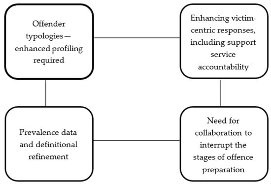 The findings in this study lend support to further exploring how stakeholder collaboration could assist primary, secondary, and tertiary prevention approaches [63] to TCSA. Specifically, the participants’ prioritisation of the research questions identified throughout the day offers a potential starting point for future collaborations. It followed that offending behaviour (how offenders know where to go) and victim safeguarding (ensuring support and accountability for responses to victims) should be seen as the primary areas for multi-agency collaboration.