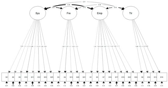 Frequencies, asymmetry, and kurtosis parameters for each original item can be seen in Table S1. Due to their low discriminative capacity, we decided to remove items with an asymmetry and kurtosis greater than 1 or less than −1 (eight items) and/or 90% of the cases included in one of the two halves of the Likert scale (nine additional items). We then calculated item-total correlations as well as a unidimensional IRT unconstrained latent variable model with the remaining 27 items. An item on professional pessimism (9), was removed because of nil (r = −0.034) correlation with the rest of items and low discrimination parameter (−0.057). All the remaining items had discrimination parameters above 0.5 within a unidimensional IRT model.