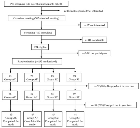 Sequence for recruitment screening. AC: active/clean air group; AP: active/polluted air group; SC: sedentary/clean air group; SP: sedentary/polluted air group.