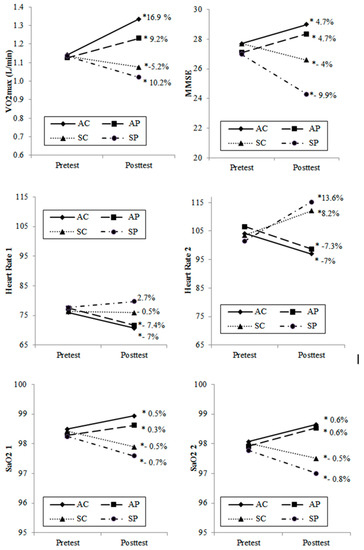 The groups of sedentary women (SC and SP), scored a lower cardiorespiratory performance (VO2max) with respect to the active groups at the end of the experiment (Table 4). In the intragroup changes between the beginning and the end of the experiment there was a statistically significant decrease (p < 0.05) of VO2max of −5.2% and −10.2% in the SC and SP groups, respectively (Figure 2). Previous studies indicate that the decrease of aerobic capacity in older people may be due, among other factors, to a decrease and poor distribution of cardiac output, to a reduced oxidative capacity of skeletal muscle [33], to a limited mitochondrial content/mitochondrial dysfunction due to age [34], or to a decrease of the pulmonary function indices due to air pollution [35].