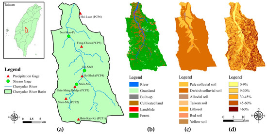 The Chenyulan River, located in Nantou County, Taiwan, is 42 km long and originates from Mt. Jade at a height of 3910 m above sea level. The Chenyulan watershed has an area of 449 km2 elongated in the north-south direction, with an average altitude of 1540 m and a slope of 32° (Figure 1a). The observation stations include one weather station (namely PCP2 in this study), five automated precipitation gauges (PCP1, PCP3, PCP4, PCP5, PCP6), and three gauges of streamflow and sediment export (Shen-Mu, Ho-Sheh, Nei-Mao-Pu). Two gauges (Shen-Mu, Ho-Sheh) stopped recording streamflow and sediment export in 2001, and only Nei-Mao-Pu station has continuous records until now. More than 70% of the watershed is covered by forest, and cultivated lands are mostly distributed in the valley region (Figure 1b). Darkish colluvial soil is dominant (82.38%) in the watershed, followed by pale colluvial soil (12.29%), lithosol (4.19%), alluvial soil (0.89%), Taiwan clay (0.22%), yellow soil (0.03%), and red soil (0.002%) (Figure 1c). The major area (49.58%) is of a slope greater than 60%, followed by a slope of 45–60% (19.60%), 30–45% (15.14%), 9–30% (12.38%), and 0–9% (3.30%) (Figure 1d). The average annual precipitation in the Chenyulan watershed is between 2000 and 4000 mm, and approximately 80% of annual rainfall is between May and October (typhoon season). During 2008–2013, there were five to eight typhoons each year, and the most severe were Typhoon Sinlaku (1468.5 mm of accumulated rainfall at Shen-Mu gauge during 11–16 September 2008), Typhoon Morakot (2858.5 mm during 5–10 August 2009), Typhoon Fanapi (287.1 mm during 17–20 September 2010), Typhoon Nanmadol (241 mm during 27–31 August 2011), Typhoon Saola (665.5 mm during 30 July to 3 August 2012), and Typhoon Soulik (881 mm during 11–13 July 2013).