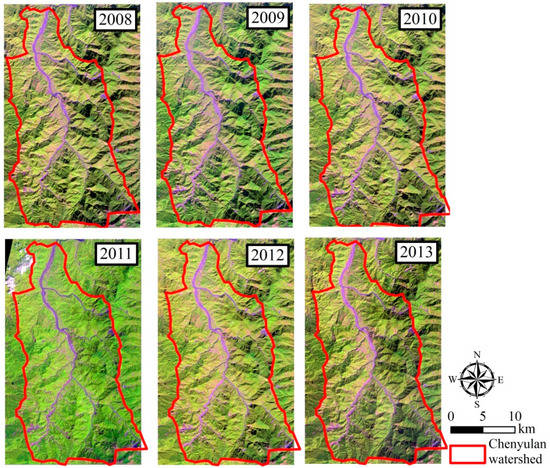 In order to evaluate the impact of natural disturbances on the watershed, we collected SPOT images taken on 28 November 2008, 2 December 2009, 21 November 2010, 22 September 2011, 25 October 2012, and 15 November 2013 (Figure 2). The SPOT images were purchased from the Space and Remote Sensing Research Center (SRSRC), and further used for watershed land cover classification.