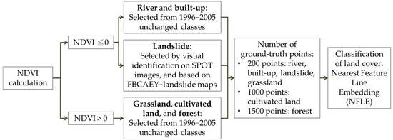 Based on the NDVI maps (Figure 3), the watershed was divided into two groups: NDVI ≤ 0 and NDVI > 0. The areas of NDVI values smaller than 0 indicate that the possible land cover type is river, built-up, or landslide, while the areas of NDVI values greater than 0 indicate grassland, cultivated land, or forest. We additionally collected the land cover classifications of 1996 and 2005 from [33] and the landslide maps reclassified by satellite images derived from the Forestry Bureau, Council of Agriculture, Executive Yuan (FBCAEY) as reference maps. Areas where specific land classes were unchanged between 1996 and 2005 helped to narrow down the supervised boundary, and the FBCAEY landslide map helped to increase the accuracy of landslide area selection.