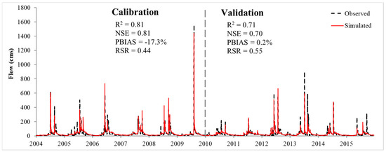The calibration and validation results for daily streamflow showed that there was no significant difference between two land cover scenarios. The model performance was very good in terms of R2 = 0.81, NSE = 0.81, PBIAS = −17.3%, and RSR = 0.44 for calibration, and R2 = 0.71, NSE = 0.7, PBIAS = 0.2%, and RSR = 0.55 for validation (Figure 7).
