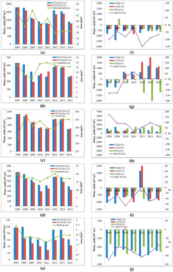The difference in water yield was directly reflected by the change in land cover area during 2008–2014 (Figure 10f–j). Generally, due to decreasing areas of cultivated land, grassland, and built-up areas in the watershed, water yields decreased by 2.7 × 109 to 19.6 × 109 m3, 12.5 × 109 to 5.2 × 109 m3, and 3.5 × 109 to 1.8 × 109 m3, respectively, during 2008–2014 compared to the constant land cover scenario results.