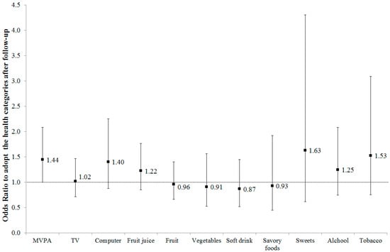 After adjusting for confounders, adolescents from the intervention group were more likely (OR = 1.44; 95% CI: 1.00; 2.08; p = 0.50) to adopt the physical activity guidelines after follow-up, in comparison to adolescents in the control group. No significant changes were observed for the other lifestyle factors (p > 0.05, see Figure 1).