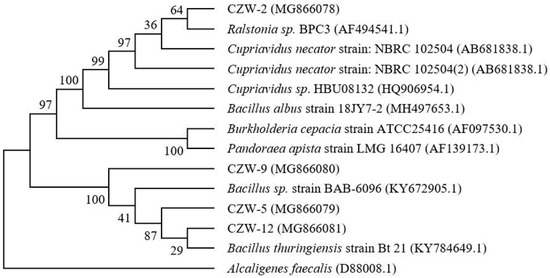 The sequencing results of the strains were uploaded to the Biotechnology Information Bank and compared with the known sequences in GenBank [6]. The phylogenetic tree (Figure 1) reveals that strain CZW-2 corresponds to Cupriavidus sp. with 98% certainty; CZW-5, CZW-9 and CZW-12 correspond to Bacillus sp. with 100% certainty. These strains were with strong heavy metal resistance and the capacity for biodegradation, and widely used to remove heavy metals from contaminated environments [17,30]. The genus Cupriavidus is a β-proteobacterium that thrives in some of the harshest environments [31]. In previous studies, Mergeay et al. [32] had isolated Cupriavidus metallidurans CH34 from industrial sites polluted by industrial wastes rich in toxic heavy metals, and found that it has strong heavy metal tolerance. Zhu et al. [8] isolated Bacillus cereus NS4 from the industrial soil of a battery factory, and utilized it on a large scale to remedy nickel contaminated soil.