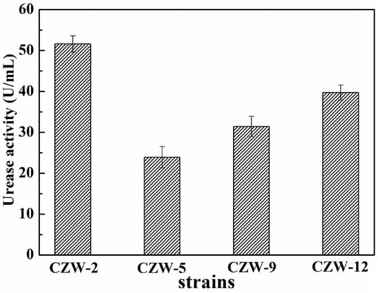 Urease is the key to the formation of precipitates of calcium carbonate in a medium containing the substrate urea and a calcium source [33]. The urease activity of four strains is shown in Figure 2. Among the isolated strains, CZW-2 showed the highest urease activity was 51.6 U/mL. The urease activities of CZW-5, CZW-9 and CZW-12 were 23.9 U/mL, 31.4 U/mL and 39.7 U/mL, respectively. The above results were analyzed by the one-way ANOVA method in SPSS 22.0 (IBM, New York, NY, USA), and there were significant differences among all the data (p < 0.05). During the bacterial growth period, the urease activities of CZW-2 were obviously an advantage compared to the other three strains.