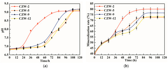 Previous studies have shown that strains have higher urease activity under neutral or alkaline conditions [34,35]. In this study, the strains were added to a medium containing urea and Cd2+ at conditions of pH = 7 and 37 °C for Cd2+ precipitation (Figure 3). Figure 3a shows the change in pH during the process of Cd precipitation for four strains. Compared with the other three bacteria, CZW-2 has a rapid increase in pH and a short delay time for the strain to enter the logarithmic growth stage. At this time, the bacteria multiply in the culture medium and produce urease to hydrolyze urea, thereby rapidly generating NH4+ and CO32− to cause the pH increase, accelerating the biochemical reaction in the liquid environment [36]. The other three strains of CZW-5, CZW-9 and CZW-12 exhibit similar urease activity, pH value and removal rate. During 0–48 h, the pH of the mineralization system exhibits a small increase. However, during 48–108 h, the pH of the mineralization system increases by approximately 1.6, reaching values of 9.15, 9.17 and 9.11, respectively. After 108 h, the four strains basically reach a stable phase at the same time. In short, strain CWZ-2 had the highest efficient hydrolysis of urea, and significantly better than the other three strains.