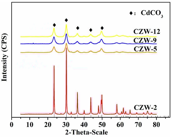 To qualitatively analyze the precipitated substances, XRD analysis was carried out. The XRD spectra of the precipitated substances produced by CZW-2, CZW-5, CZW-9 and CZW-12 mineralization were observed (Figure 4). The XRD spectra revealed that the mineralized products were CdCO3. The peak intensity decreased in the following order: CZW-2 > CZW-12 > CZW-9 > CZW-5. The main CdCO3 peak of CZW-2 was much higher than the other three strains, and showed that the degree of crystallinity of CZW-2 was better than that of the other three. This relationship indicates that the higher the peak, the smaller the peak width, and the better the crystallinity [42].