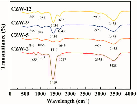Fourier transform infrared spectroscopy (FTIR) analysis of the precipitates produced by CZW-2, CZW-5, CZW-9 and CZW-12.