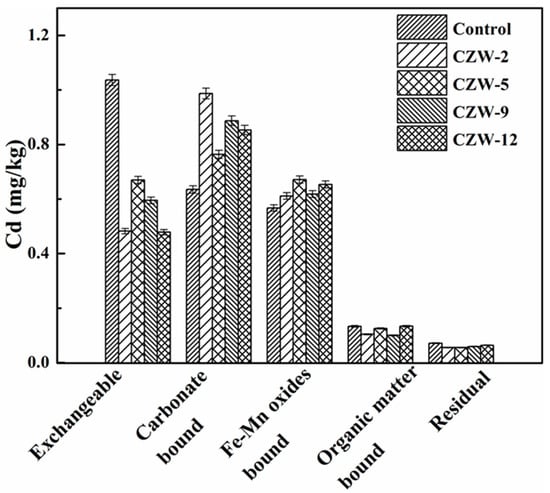 The bioremediation efficiency of isolated strains was tested in Cd-contaminated soil. Soil samples had an initial total Cd concentration of 5.10 mg/kg. The results of the bioremediation of strains and control after one month are shown in Figure 7. The five fractions in the control soil samples showed the following distribution: exchangeable > carbonate-bound > Fe-Mn oxides-bound > organic matter-bound > residual forms. In the remediated soil samples, the following distribution was obtained: carbonate-bound > Fe-Mn oxides-bound > exchangeable > organic matter-bound > residual forms. Compared to the control samples, the carbonate-bound and exchangeable fractions in the bioremediation soils changed significantly; the carbonate-bound fractions in the bioremediation soils by the mineralization of the strains CZW-2, CZW-5, CZW-9 and CZW-12 increased by 55.42%, 20.27%, 39.67% and 34.36%, while the exchangeable fraction decreased by 53.30%, 35.33%, 42.54% and 53.80%, respectively. However, there was no obvious change in Fe-Mn oxide fraction of Cd in the bioremediation soils and the control. The limited interaction between the isolated four strains and Fe-Mn oxide fractions of Cd may be due to the limited bioavailability [22]. The organic matter bound part of Cd may be complexed or adsorbed as was reported by previous studies [6]. Therefore, the interactions between bacteria and metals are inhibited. The residual fraction of Cd did not change significantly in the bioremediation soils and the control, which, due to the residual fraction of Cd, are tightly bound and very stable under natural conditions [57].