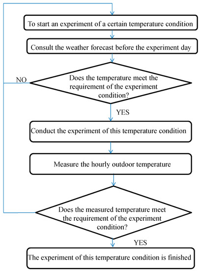 Most experiments of related literature were conducted in an experiment chamber. In this study, the experiment was conducted in an actual site. The experiment chamber can supply ideal temperature control; however, the space in the chamber is closed and narrow, and it cannot supply natural daylight. In this study, the experiment duration of each temperature condition lasted for 24 h. If the experiments are conducted in an experimental chamber, there may be issues of psychological anxiety, fuzziness, impatience, and other abnormal emotions, and finally influence the experiment results. For actual site, although the temperature is affected by the weather, if the experiment day is well-selected, the above problems can be avoided. In this study, all experiments in different temperature conditions were conducted on sunny days in the summer. Although the maximum temperatures were different, the changing trends of the outdoor temperature were similar. To choose the experiment day of a certain temperature condition, the hourly temperature of the weather forecast before the experiment day was consulted. When that met the experiment condition, the experiment was then conducted in the next day. When conducting the experiment, the hourly outdoor temperature of the experiment day was also measured to verify the experiment condition. When the measured hourly outdoor temperature met the requirement of the experiment condition, the experiment condition was finished. Otherwise, the experiment of this temperament condition was to be reconducted. The flowchart to select an experiment day of a certain temperature condition is shown in