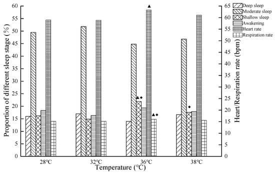 In the present study, the average heart rate and respiratory rate in the sleep stage significantly increased, and the average heart rate and respiratory rate of the 36 °C group was higher than that of 32 °C and 28 °C. High temperatures result in poor sleep quality, thermal discomfort, and an increase of the heart rate [