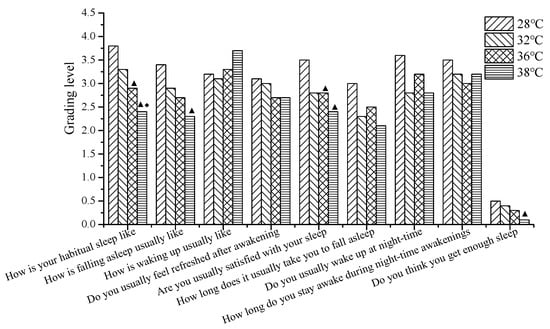 Sleep quality at 32 °C was the best, followed by that at 28 °C, while sleep quality at 36 °C and 38 °C was the worst. The significant effects of high temperatures on sleep quality were mainly reflected in sleep duration and shallow sleep.