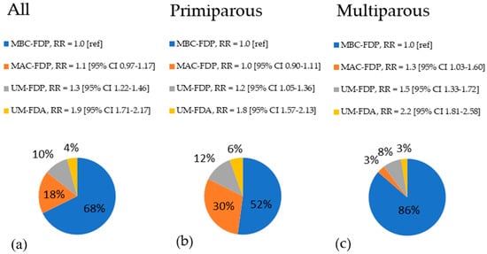 Pie charts of frequencies of Marital-Father Data groups in the entire group of mothers (a) and separately among primiparous (b) and multiparous (c) together with adjusted risk ratios of preterm birth, associated with different types of mother-father relationship (proxied by Marital-Father Data groups), calculated with reference to MBC-FDP group.