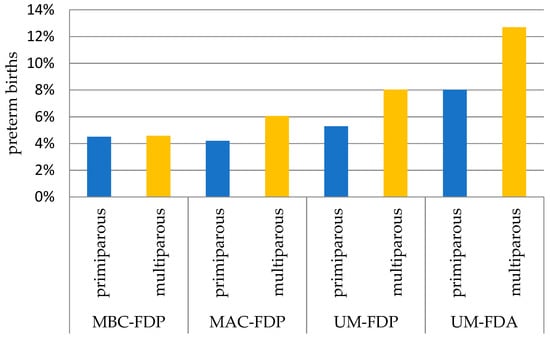 Paternity status has always been analyzed in the context of length of gestation and other birth outcomes in terms of the effect of the level of father’s involvement or support [36,37]. In our study we considered paternity status as a detrimental factor on preterm birth risk via its potential to exacerbate maternal stress. We argued that not only this factor but also pregnant women remaining in informal unions or even premarital pregnancy (in married women) may induce a higher level of anxiety and insecurity about their and their child’s future, which in turn leads to adverse pregnancy outcomes as compared with traditional marriage. We hypothesized that the size of preterm birth risk reflects the intensity of maternal stress related to the mother’s level of insecurity. Since the level of uncertainty is related both to the psychosocial status of pregnant women and to a large extent to the father’s financial support, it is quite likely that parity affects pregnancy outcomes more strongly than in the case of mothers who have more than one child. Thus, we assume that multiparous women are more likely to experience an elevated level of psychological distress during pregnancy resulting in greater increase in PTB as compared to the primiparous level. Therefore, we constructed the Maternal-Father Data index with four study groups comprising women for whom the father’s data were present or absent on the birth record (paternity status) together with women of four marital statuses (which serves as a proxy for the intensity of maternal psychosocial stress evoked by the perception of insecurity): (1) married before conception (direct family forming), with father data present (MBC-FDP), (2) married after conception (legitimizing marriages) with father data present (MAC-FDP), (3) unmarried with father data present (UM-FDP), and (4) unmarried with father data absent (UM-FDA).