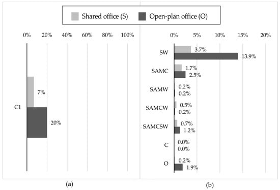 | Covariates (Reference Category) | Shared Offices (N = 597) | Open-Plan Offices (N = 481) | ||||