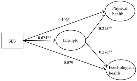 The descriptive statistics and correlation coefficients for the study variables are presented in Table 1. Correlation analyses indicated that SES was significantly correlated with both physical health (r = 0.27, p < 0.01) and psychological health (r = 0.12, p < 0.01). Moreover, lifestyle was significantly associated with physical health (r = 0.29, p < 0.01) and psychological health (r = 0.21, p < 0.01). In addition, the correlation between SES and lifestyle was significant and positive, too (r = 0.56, p < 0.01). These results provided good preliminary support for the hypotheses.